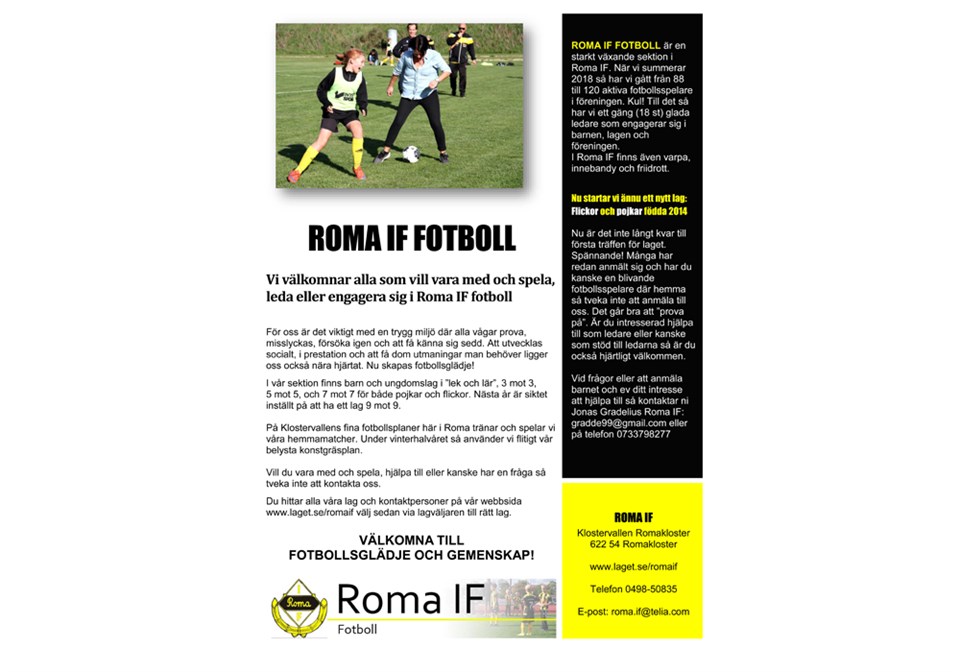 Solen har börjat värma, gräset är grönare och linjerna vitare. Nu startar vi fotbollens utomhusträning på gräs! Vill du hänga på eller känner du någon som kanske vill vara med så finns kontaktuppgifter till alla ledare och lag här på vår webbplats: www.laget.se/RomaIF/ Här kommer även alla träningstider finnas. Håll utkik! Välkomna till fotbollsglädje och gemenskap! Roma IF Fotboll Roma IF 19 apr 2019 0kommentarer